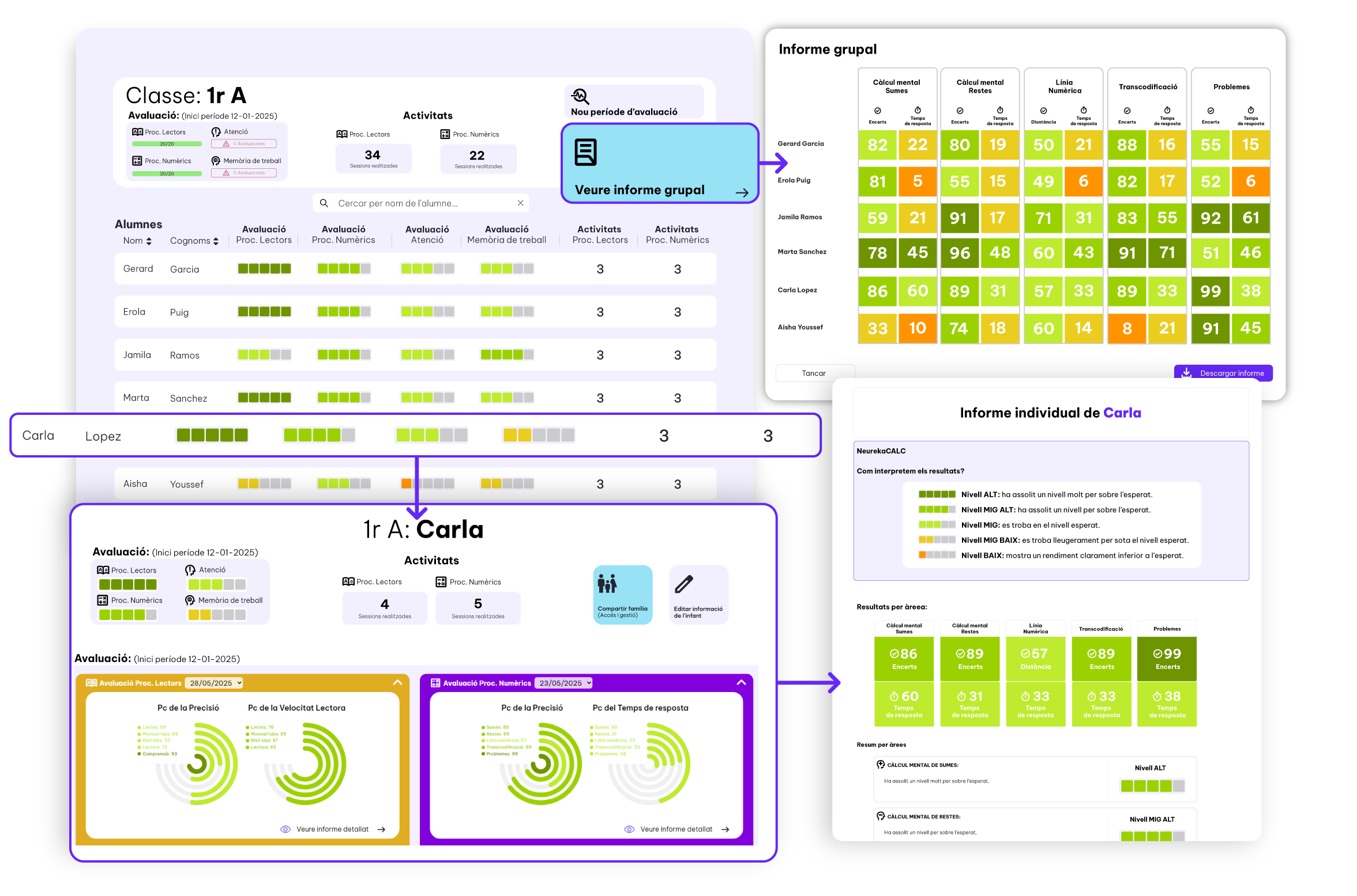 Tot en un sol espai, amb informes automàtics per alumne i per grup, gràfics fàcils d’interpretar i recomanacions directes per intervenir a l’aula.